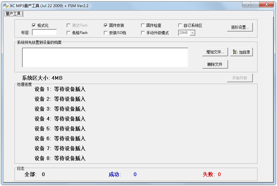 只要采用LD2088主控的MP3产品都可以使用,不限制品牌,当你的mp3出现任何故障的时候都可以使用本量产工具来修复,比如 不能开机,不能进入界面等,其原理就是升级固件来达到修复,这个版本不但有量产工具,还含有通用的五键有录音有FM的固件供直接使用