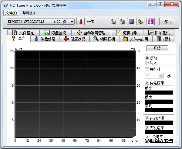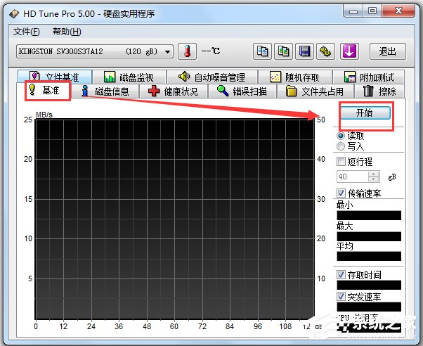 1、在软件的主界面上,首先是“基准检查”功能,直接单击右侧的“开始”按钮可以马上执行检测操作,软件将花费一段时间检测硬盘的传输、 存取时间、 CPU占用率,让你直观地判断硬盘的性能。