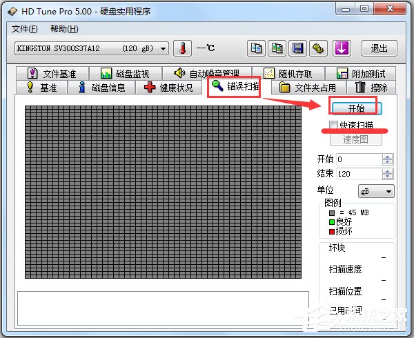 2、点击选项卡切换至错误扫描,如图,然后在红框位置,尽量不要勾选“快速扫描”的情况下点击开始,因为快速扫描速度固然会很快,但是就像杀毒软件一般,快速扫面并不能将深层次的病毒扫描出来一样,这里面的快速扫描也不能最真实的反映硬盘的真实坏道状况。