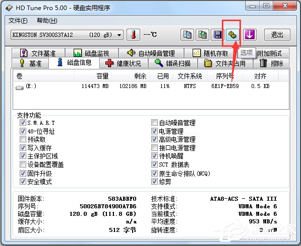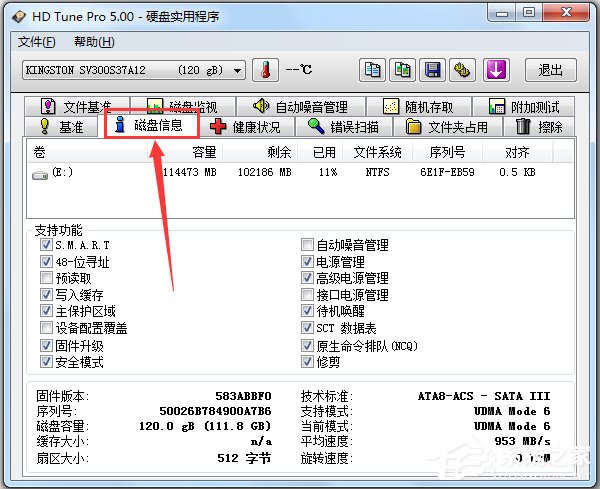 3、如果希望进一步了解 硬盘的信息,可以单击切换到“信息”选项卡, 软件将提供系统中各硬盘的详细信息,如支持的功能与技术标准等,你可以通过该选项卡了解硬盘是否能够支持更高的技术标准,从多方面评估如何提高硬盘的性能。