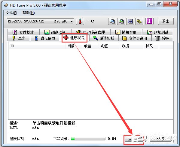 4、此外,单击切换到“健康状态”选项卡,可以查阅硬盘内部存储的运作记录,评估硬盘的状态是否正常。你不必担心不懂得如何了解这些信息, 软件将直观地以状态好坏来告诉你。