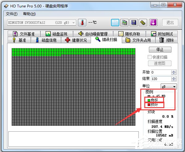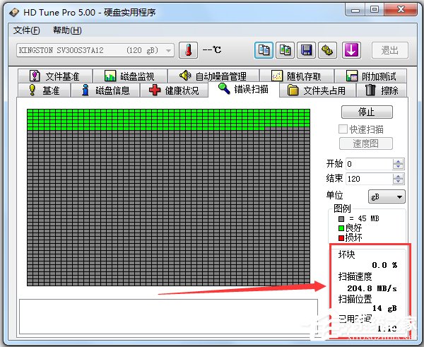 3、扫描进行中,注意软件的右下方,红框内是硬盘检测的健康图里,绿色代表健康的数量,红色则代表坏道