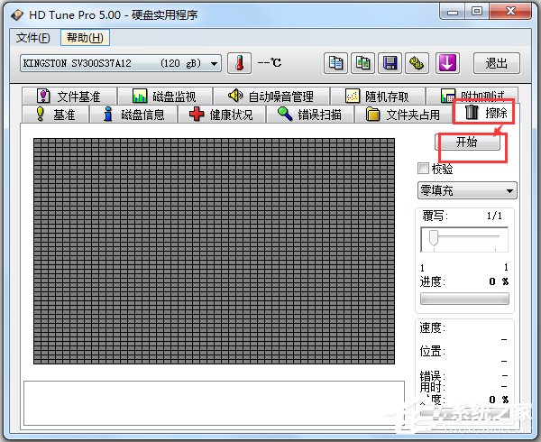 使用HDTune,对整盘进行“擦除”,需要说明的是,这里的“擦除”实际是针对HDD而言的,是用数据进行填充,并非SSD的擦除概念,因此,实际要做的就是对整盘进行数据填充。直到完全填充