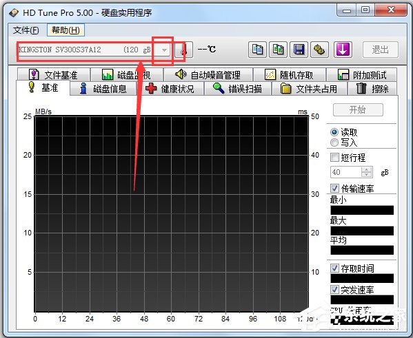2、如果你的系统中安装了多个硬盘,可以通过主界面上方的 下拉菜单进行切换,包括移动硬盘在内的各种硬盘都能够被 HD Tune支持,你可以通过HD Tune的检测了解硬盘的实际性能与标称值是否吻合,了解各种移动硬盘设备在实际使用上能够达到的最高速度。