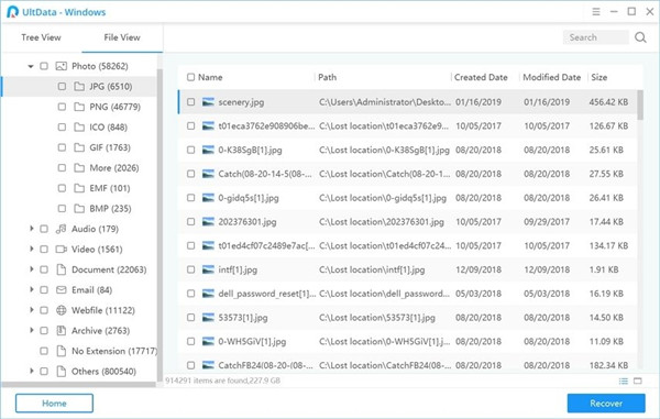 单击“扫描”和UltData - Windows将彻底扫描。完成后,它将列出所选位置中的所有已删除文件。