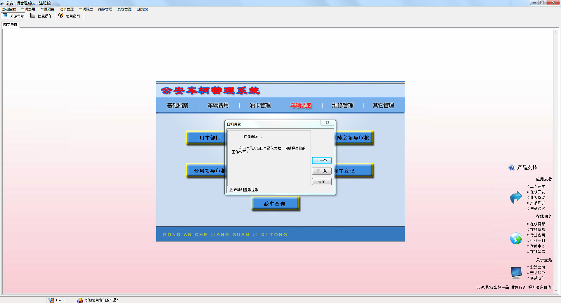 该系统可以实现对公安机关单位中的车辆档案、驾驶员档案、车辆各项目费用,油卡管理、车辆调度、维修管理、车辆违法登记、事故登记,车辆状态及各项费用到期预警,驾证到期预警等功能能,是一款有效的管理软件。