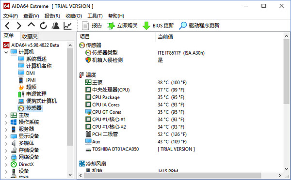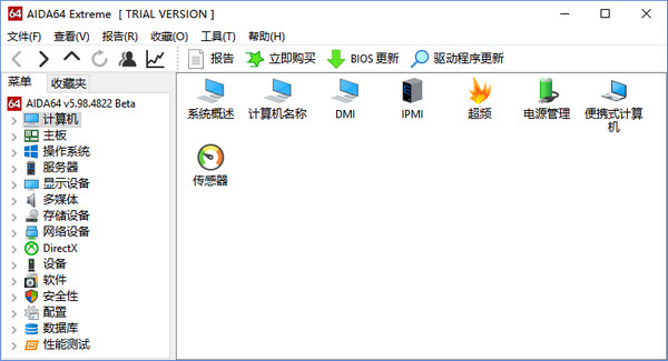 AIDA64原名EVEREST,是专业测试硬件信息和系统信息的好工具,它针对系统硬件能查探的信息远比CPU-Z等专业硬件检测软件丰富,还支持硬件性能测试,可以得出内存读写速度、CPU超频速度、硬盘读写速度等信息。支持生成系统状态报告,即把所有的信息汇总为文档。