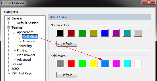 1、Options ——》 Global Options ——》 Terminal ——》 Appearance ——》 ANSI Color。