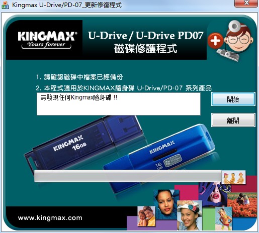 胜创KingmaxU盘修复工具官方版主要修复量产kingmax超棒或UD(U-Drive)或Easy Driver失败后想恢复官方出厂状态。