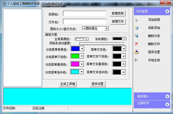 个人超级工具箱制作专家是一款方便的小工具,可以把您觉得好用的程序添加到工具箱,将程序集合到一起。可以对这些程序进行自由创建分类文件夹,方便用户使用也便于传输分享给自己的朋友们。还可以随意设计工具箱的颜色、标题、字体等。