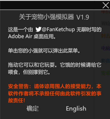 我们进入设置,能修改它的名字和显示尺寸。首次启动软件,如果是英文的,可以在关于界面,设置简体中文。目前,该宠物桌面的玩法,还比较单一。不过,作者的更新频率非常高,应该会不断增加新功能。