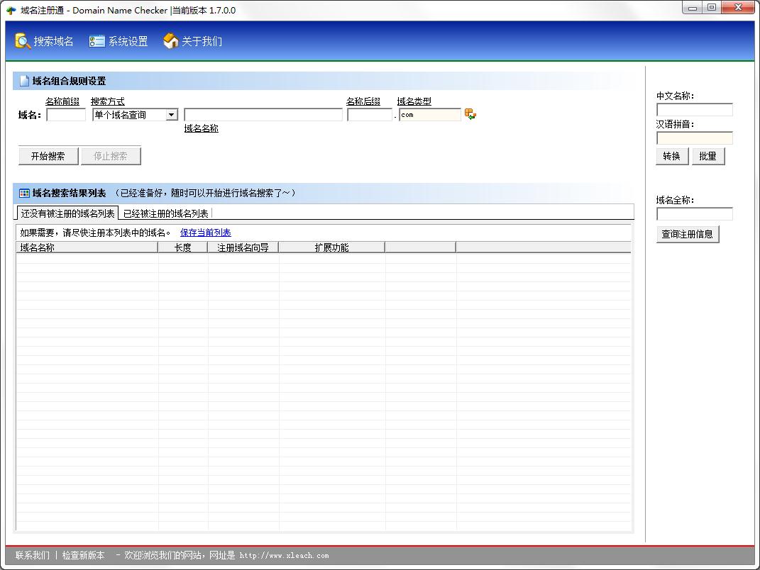 3.对于当前广泛使用的多种域名后缀均能有效支持,专业版现支持有com, net, org, ae, aero, asia, be, biz, ca, cc, ch, cn, com.cn, co, edu, eu, fr, gd, hk, ie, im, in, info, it, la, me, mobi, name, net.cn, nu, org.cn, pm, pro, pl, ru, se, so, tk, tv, tw, us, ws,并能够同时搜索一种或多种不同的域名后缀
