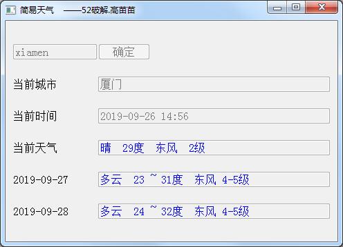 简易天气,这款天气预报软件由吾爱大神原创制作,可以通过输入城市拼音来查看天气状况,可以查看近三天的天气情况。这款简易天气预报器由Python3环境编写,目前还需要做一些优化,有相关桌面天气查询需求的朋友们可以下载试试!