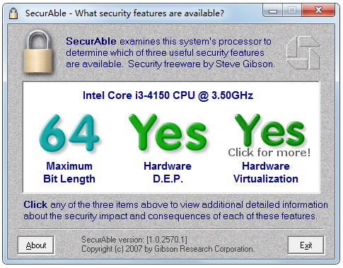 securable是一款系统检测软件,可以检测出你的电脑是否能安装Win7(64位)的系统。运行securable,即有提示:显示为64 yes yes则可以安装,显示为:64 off off(或64 no no )则不能安装。同时还可以测试你的CPU支不支持VT虚拟化技术。
