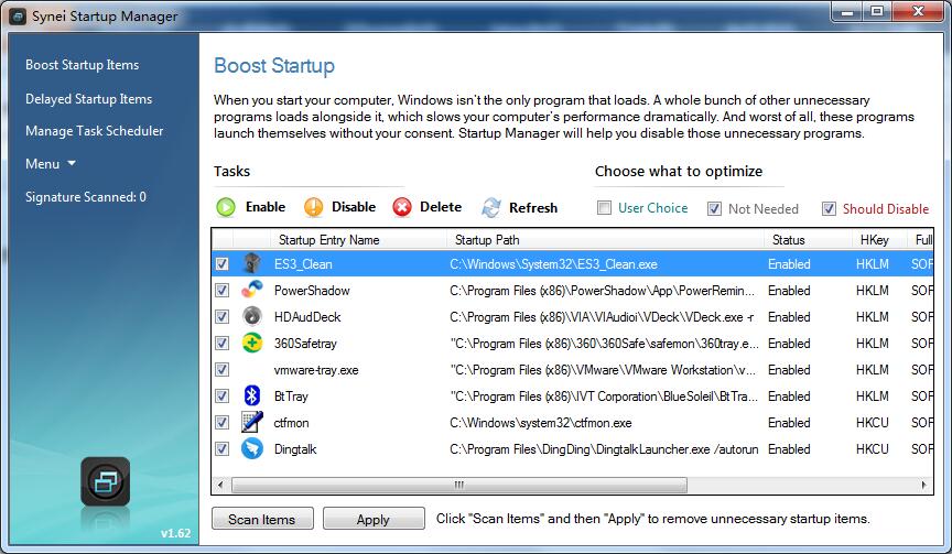 我们知道,不必要的开机启动程序太多的话,通常会影响启动速度。Synei Startup Manager是一个智能的开机启动程序管理器,它内置了一个“非必须启动”的应用特征库,可侦测超过16000种非必要的启动程序,并且可以自动将其禁用。