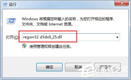 4、最后点击开始-》菜单-》运行-》输入regsvr32 d3dx9_25.dll,然后回车即可解决错误问题了。