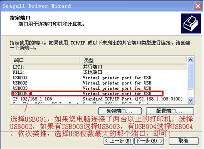 端口选择USB001,如果您电脑连接了两台以上的打印机,选择USB002,如果有USB003选择USB003,有USB004选择USB004,依次类推,选择USB后数字最大的那个USB端口,即可。