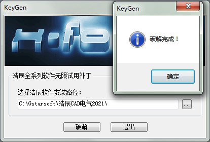 1、将无限试用破解补丁复制到软件安装目录【C:Gstarsoft浩辰CAD电气2021】,将路径设置为软件安装目录,直接点击破解即可;