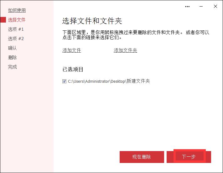文件夹成功导入到Secure File Deleter中,我们这时候可以在Secure File Deleter的主界面中看到准备删除的文件夹的路径。接下来我们要设置文件夹删除选项,点击Secure File Deleter主界面中的下一步;