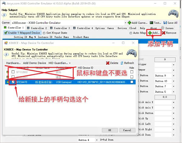Bongo Cat Mver作者已经为软件加入了XInput支持,就可以使用x360ce来伪装成一个Xbox手柄,既快速,还方便。打开x360ce,点击“Add…”进行添加手柄: