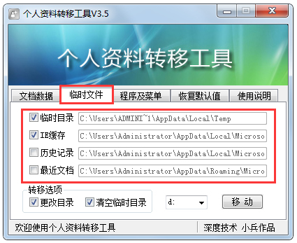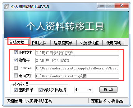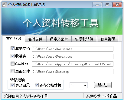 个人资料转移工具可以帮助我们把桌面、我的文档、收藏夹等比较常用于保存资料文件的系统文件夹转移到其它分区。一般用于系统重新安装,系统还原,对桌面或者我的文档里的资料进行备份的工具。