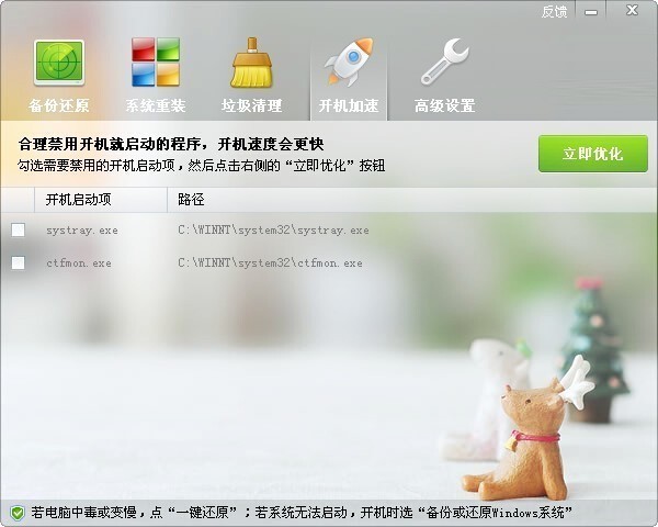 为了让您的系统在备份前就达到最佳状态,“一键还原系统”还提供了“垃圾清理”和“开机加速”两个功能,用于优化您的系统,如图: