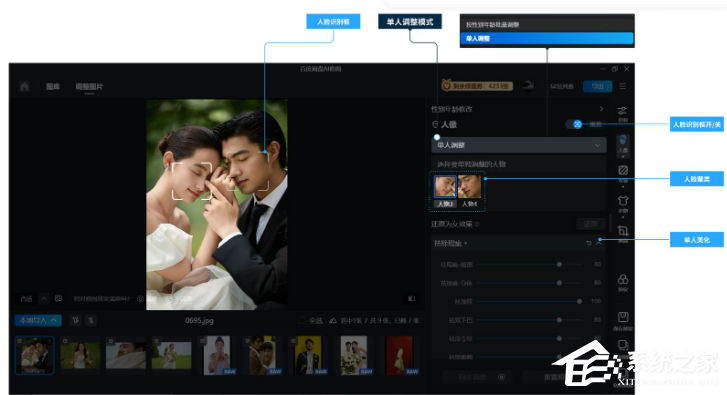 为了提供更加精细化的修图服务,我们支持单人调整功能,您可以通过点击图片中人脸快速切换到单人修图模式,从而选择图片中的单个人物进行定制化精修和微调;单人调整参数与性别年龄批量调整参数一样可以进行复制粘贴、同步调整等批量修图操作。