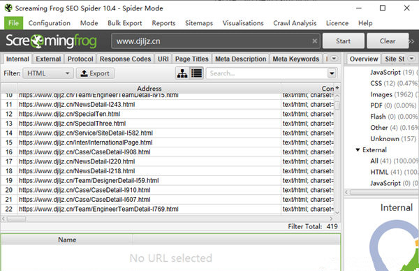尖叫青蛙强大的地方就在于它不仅获取了网站内所有的链接,我们通过链接的就能获取到该链接的所有信息,大致包括该链接包含链接数、状态码、是否被robots屏蔽、该网页标题、标题长度、描述、关键词、发布时间等等所有的信息,分析的信息详细到只有你想不到的,没有你找不到的。