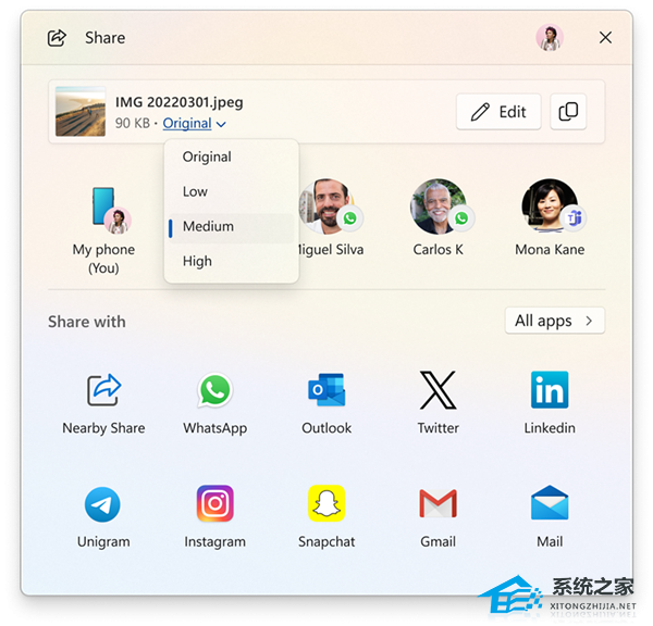 在 Windows 共享窗口中,作为快速编辑和增强图像共享功能的一部分,微软调整了用户界面,现在用户可以从高、中、低三种质量中选择压缩比例,而不再是从 0 到 100 的整个范围中选择。