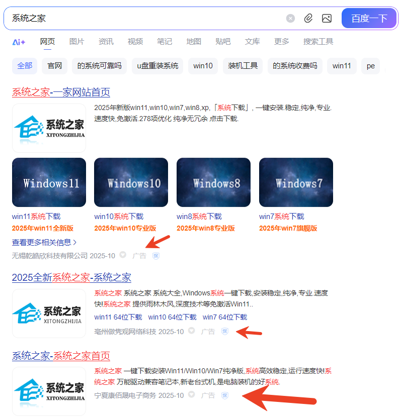 以上两个网站都是系统之家的官方网站,用户使用搜索引擎查找“系统之家”网站,注意甄别真假“系统之家”。以下带有广告字样的,都是竞价位,不是真正的“系统之家”。